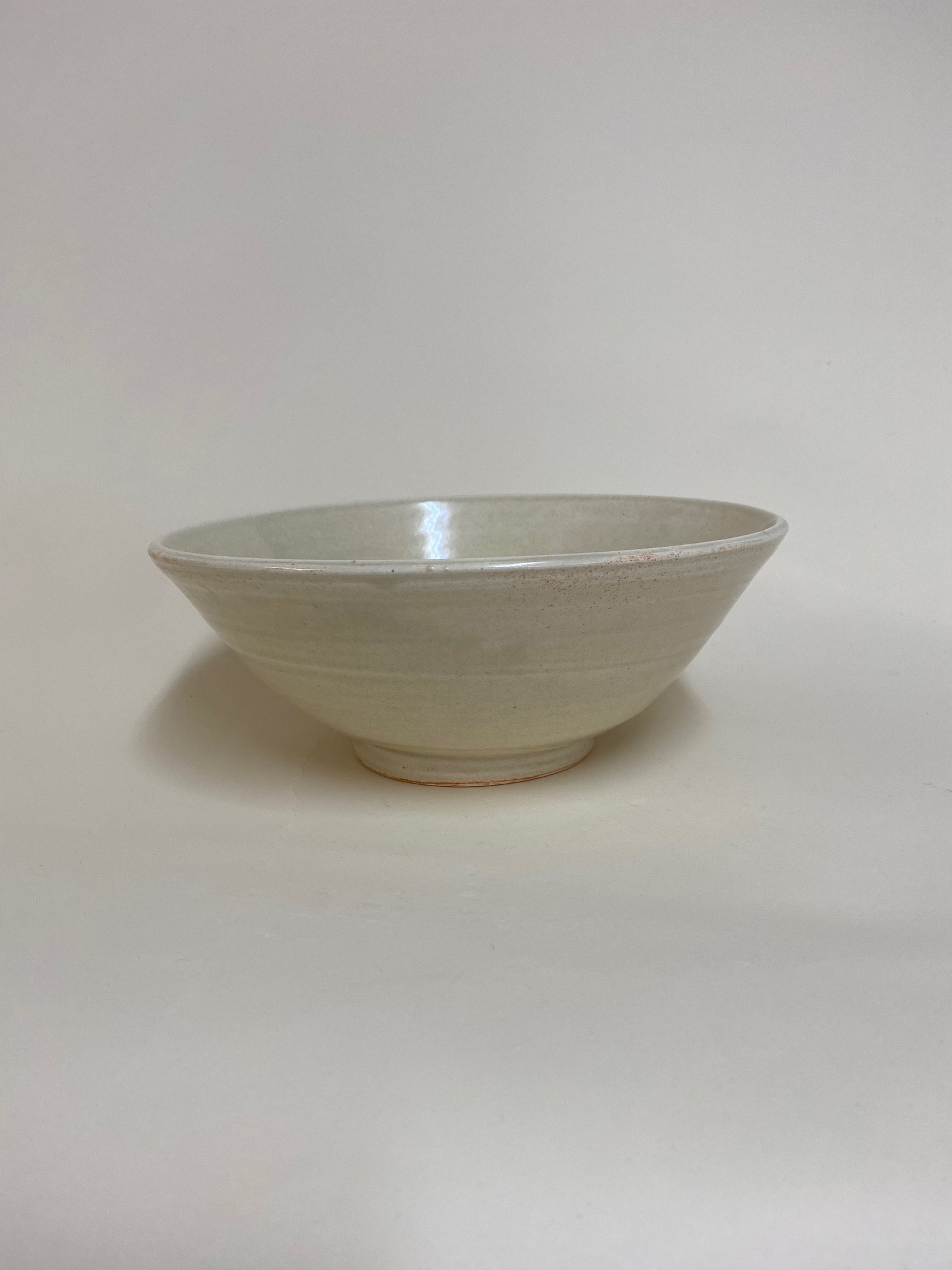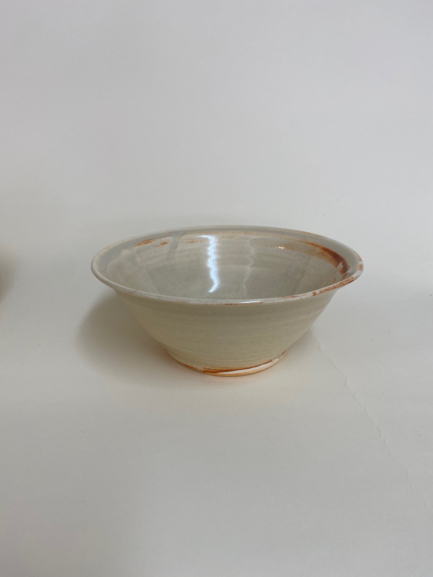 off-white salad bowl, inside has orange flashing on rim, great for salads or desserts, 9.5cm high and 24.5cm wide at rim.