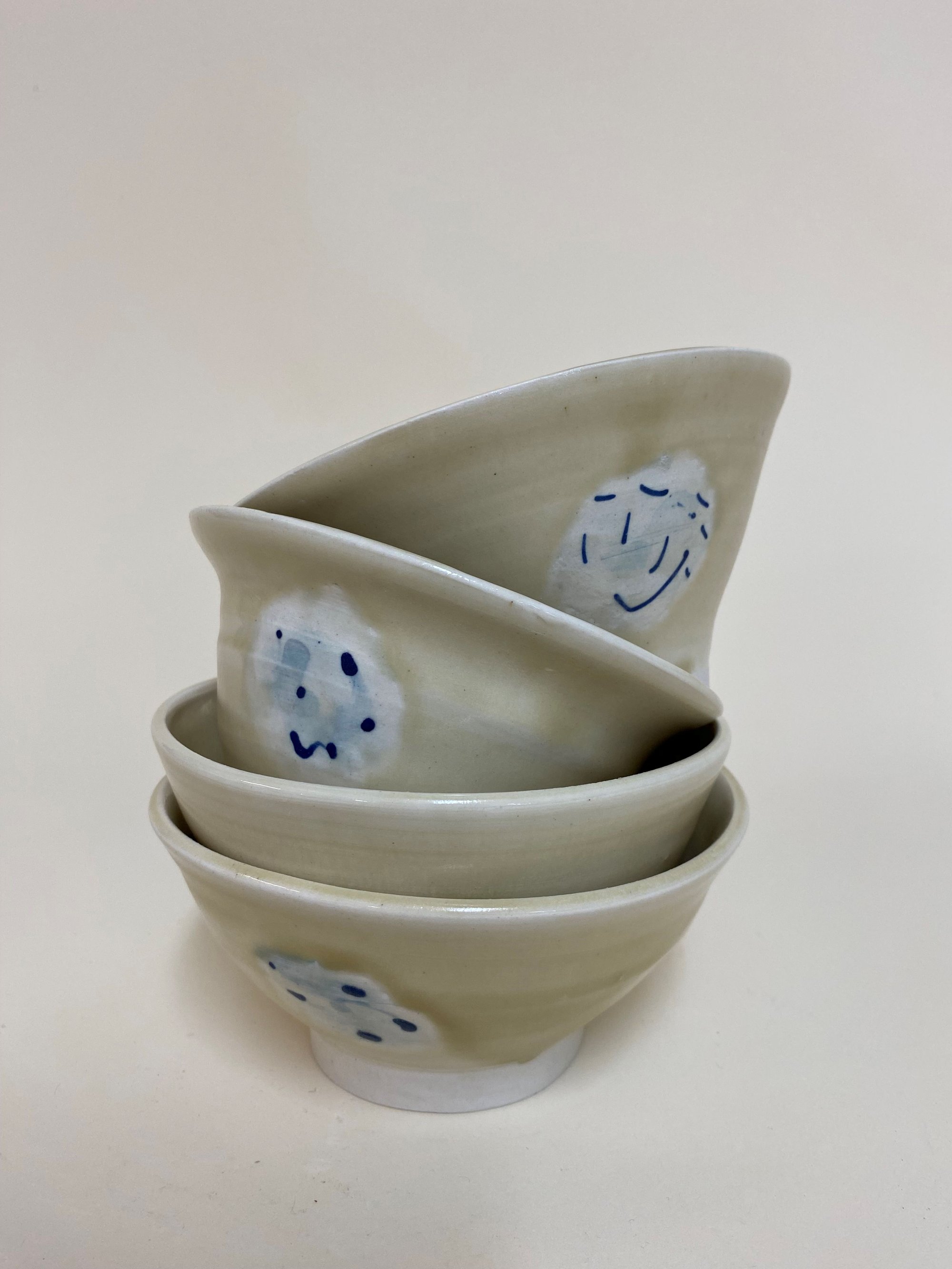 cream bowls with circle design in blue on outside